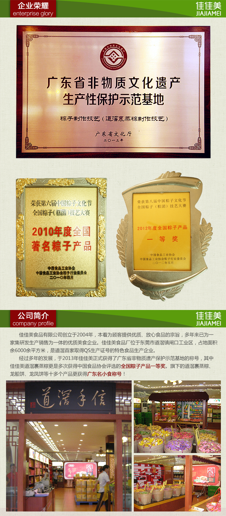 近年來,佳佳美積極響應(yīng)道滘鎮(zhèn)委、鎮(zhèn)政府 “特色食品名鎮(zhèn)”戰(zhàn)略部署,積極傳承發(fā)掘和創(chuàng)新傳統(tǒng)食品特色及技藝,走標(biāo)準(zhǔn)化、專業(yè)化、規(guī)?;a(chǎn)經(jīng)營(yíng)之路,成功從小作坊走向了小工廠、從小食品走向了產(chǎn)業(yè)化、從小土產(chǎn)走向了品牌化、從小門店走向了大市場(chǎng),企業(yè)生產(chǎn)的特色食品品種達(dá)30多個(gè),其中道滘裹蒸粽、龍船餅、龍鳳禮餅等12個(gè)食品更獲得了“廣東名小食”稱號(hào)。2005年開始,公司積極走品牌化之路,一方面,將東莞臘腸、粽子、雞仔餅等特色傳統(tǒng)產(chǎn)品整合打造“東莞手信”。